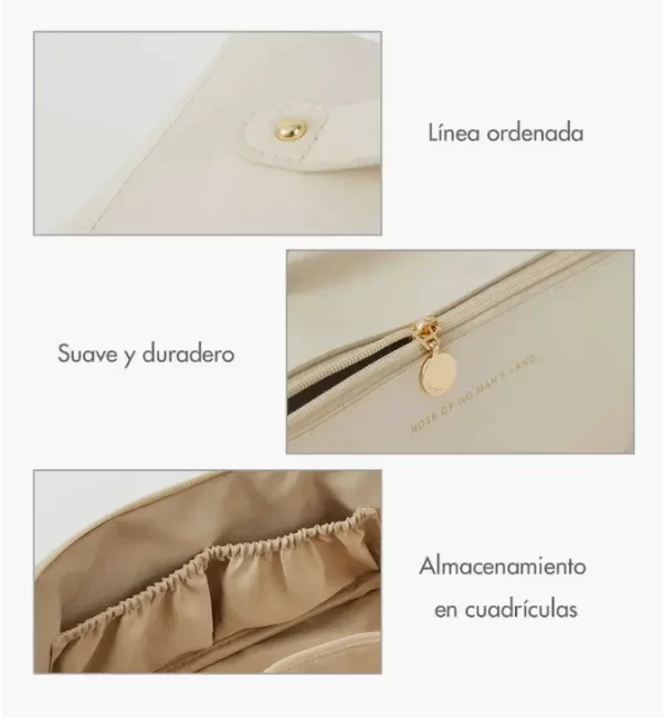 Con gran capacidad, cuenta con 2 compartimentos principales para artículos más grandes y 3 bolsillos laterales perfectos para productos más pequeños ✨.